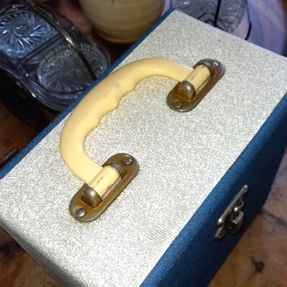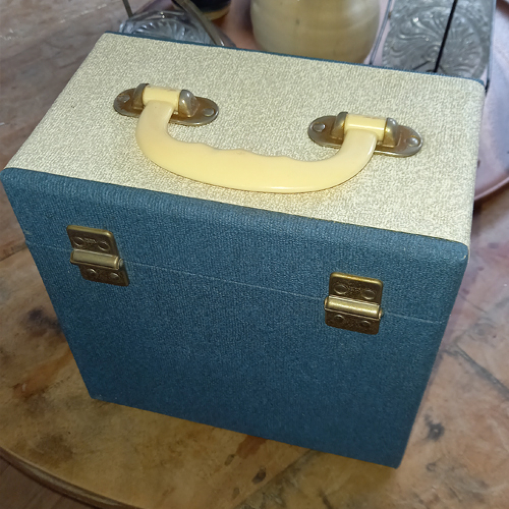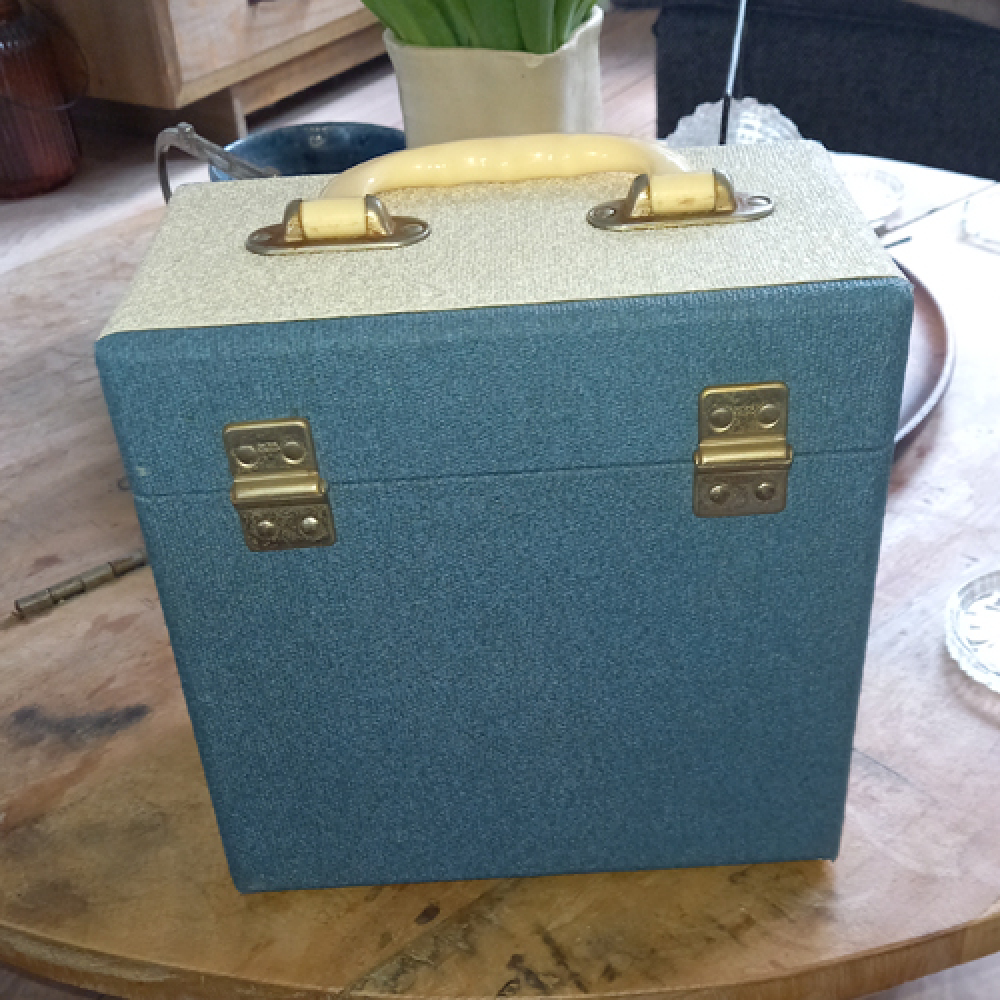 Nog in redelijke staat, vintage koffertje voor singletjes. Formaat H 21 cm B 13 cm, L 21 cm. Lichtblauw en cremkleurig.