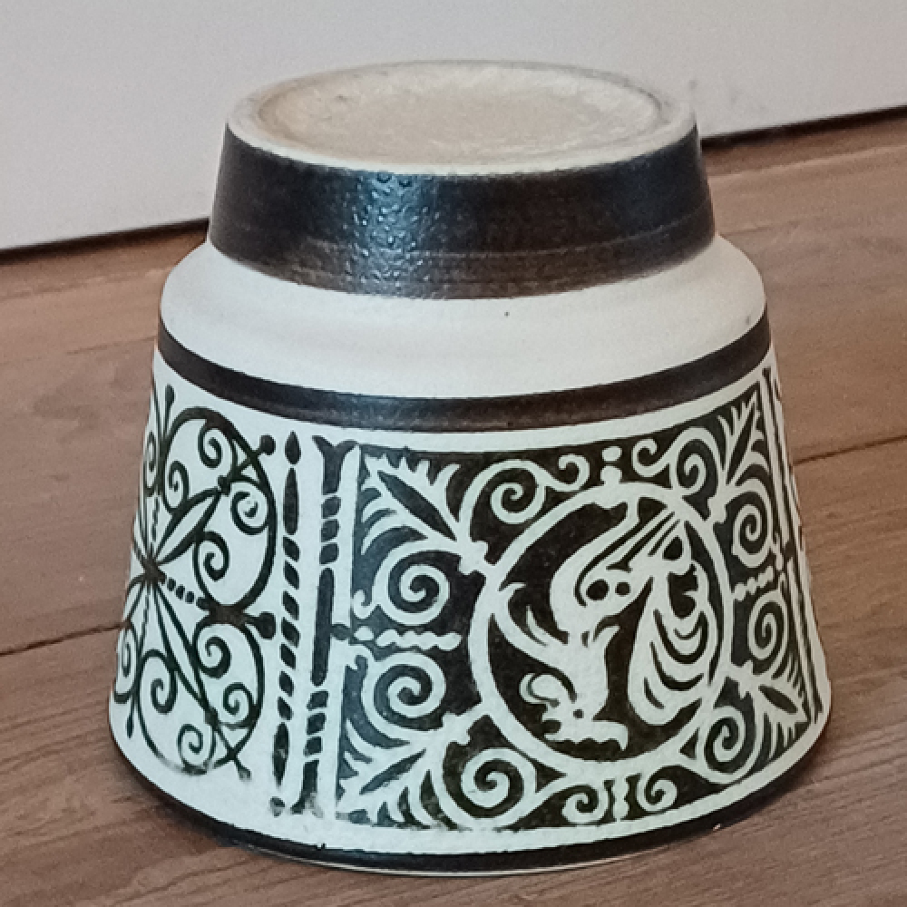 Vintage bloempot met diverse motiefjes in bruin en beige