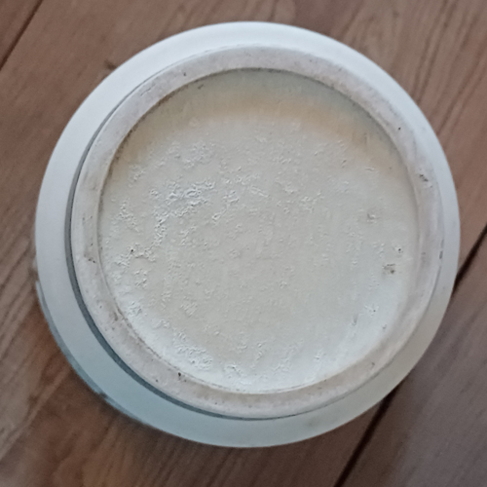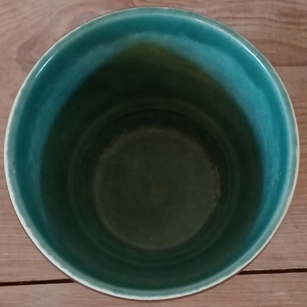 Vintage bloempot. Binnekant groen geglazuurd. Buitenkant bruine motiefjes en lichtbruine teint.
