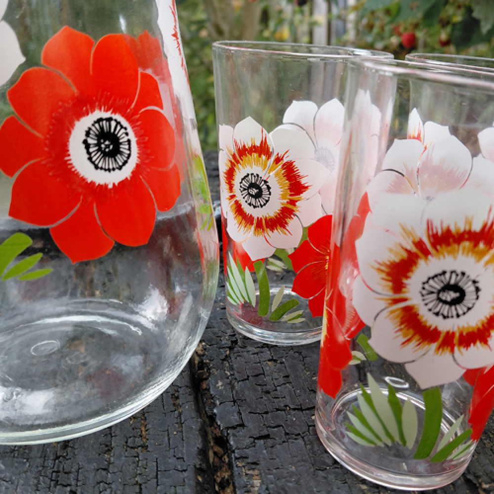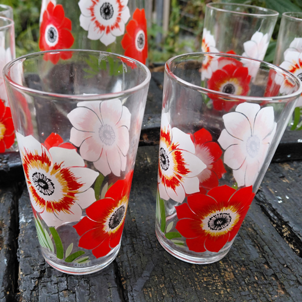 Glazen met rode en witte klaprozen